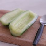 Börja med att dela gurkorna på mitten och halvera dessa delar.
