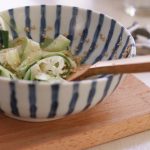 Lägg i den strimlade gurkan, rör försiktigt runt och låt dra en stund i kylen. Klart!